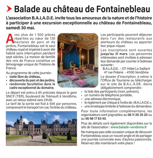L’association B.A.LA.D.E. invite tous les amoureux de la nature et de l’histoire à participer à une excursion exceptionnelle au château de Fontainebleau.