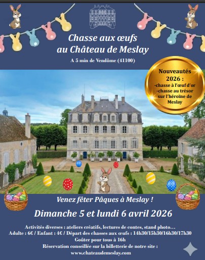 Venez fêter Pâques à Meslay : chasse aux œufs pour petits et grands. Nouveautés à la clé : une chasse au trésor pour les grands et une chasse très spéciale à l'œuf d'or pour les plus malins ! Petits et grands, rendez-vous le week-end de Pâques pour une grande chasse aux œufs dans les jardins et sur la terrasse du château de Meslay ! Une nouvelle chasse au trésor pour les plus grands, sur les traces de "l'héroïne de Meslay", Anne Louis Félicité de la Porte, qui à 18 ans, pendant la Révolution, a réussi à sauver ses parents de la guillotine. Chasse aux œufs en chocolat avec des départs à 14h30, 15h30, 16h30 et 17h30. Stands accessibles en continu : chasse au trésor, ateliers créatifs, stand photo avec déguisements, lectures de contes … Goûter à 16h. Venez tous vous amuser !
