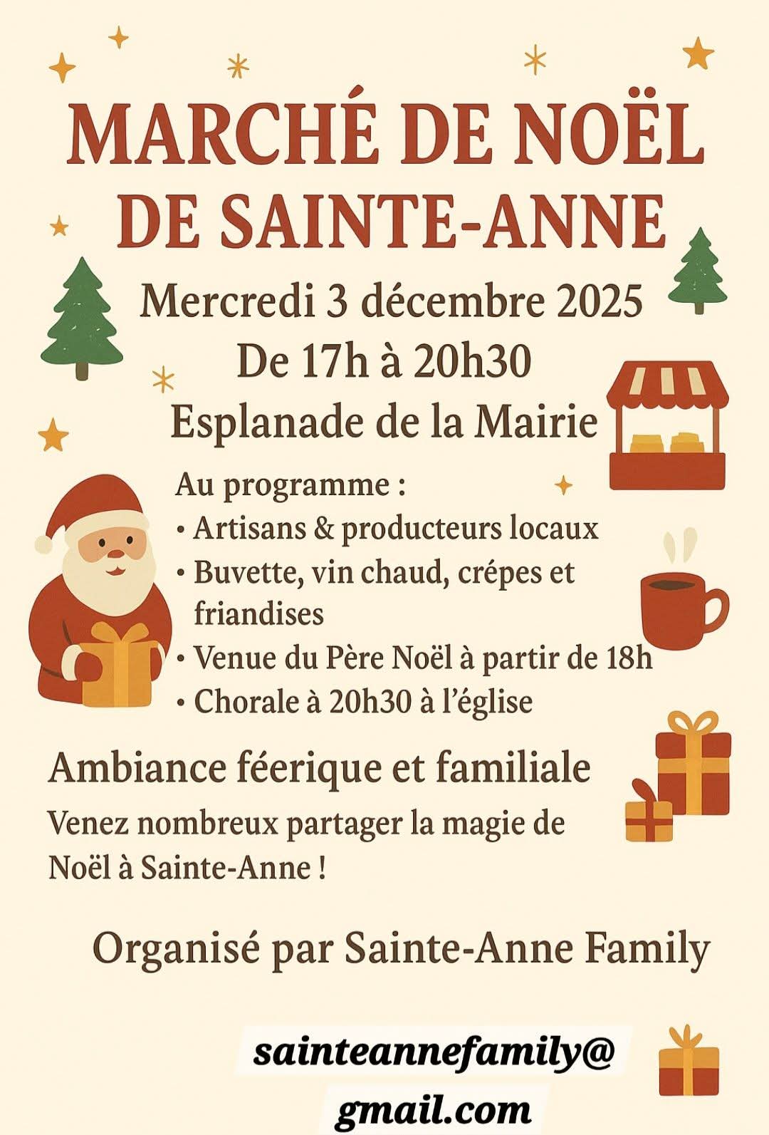 Marché de Noël à Ste-Anne mercredi 3 Décembre, esplanade de la Mairie. Artisans et producteurs locaux. Buvette, vin chaud, chocolat chaud, crêpes et friandises. Venue du père Noël à partir de 18h. Chorale à 20h30 à l'église.