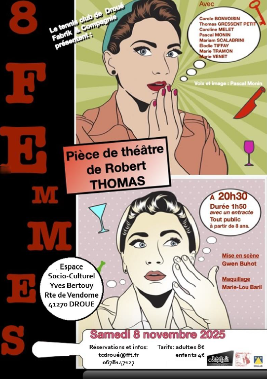 Le Tennis Club de Droué organise une soirée théâtre avec La troupe “Fabrik et Compagnie” de Rouen qui interprètera la pièce “8 Femmes”.